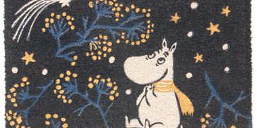 Discover charm and durability with our beautifully crafted coir doormat featuring a whimsical night sky design. Set against a deep navy background, this mat showcases a beloved Moomin character under a starlit sky with golden-yellow stars, soft blue botanical accents, and a radiant shooting star. The natural coir material ensures excellent dirt-trapping properties and long-lasting quality, making it both functional and decorative. Perfect for adding a playful, magical touch to your doorstep, this doormat is ideal for fans of Scandinavian design and those who love to make a warm, stylish first impression.